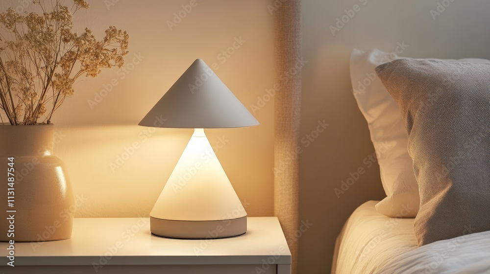 Bild auf Leinwand Modern lamp on nightstand in cozy bedroom with soft lighting and dried flowers