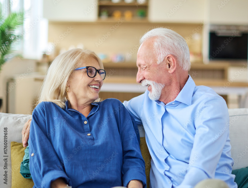 Foto Portrait of a happy senior couple embracing talking at home