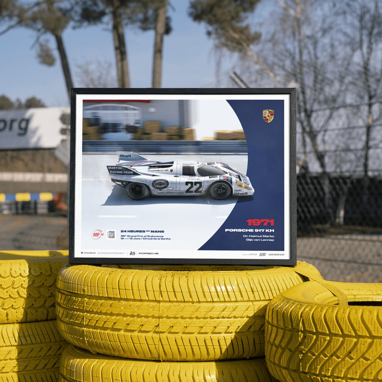 In 1971, the Porsche 917 KH in Martini livery won the prestigious 24 Hours of Le Mans race, setting two records with a distance of 5,335 kilometres and an average speed of 222.3 km/h. Driven by Gijs van Lennep and Helmut Marko, the car featured tail fins on both sides, giving it more directional stability and reducing drag. The car was also the first Porsche to race with a magnesium space frame, a material that was considerably lighter than aluminium, allowing for a 55-litre oil tank.