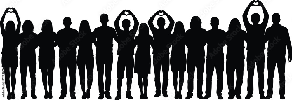 Bild auf Leinwand Silhouette of diverse people standing together, forming heart shapes with hands, unity, love, teamwork, community, and togetherness concept