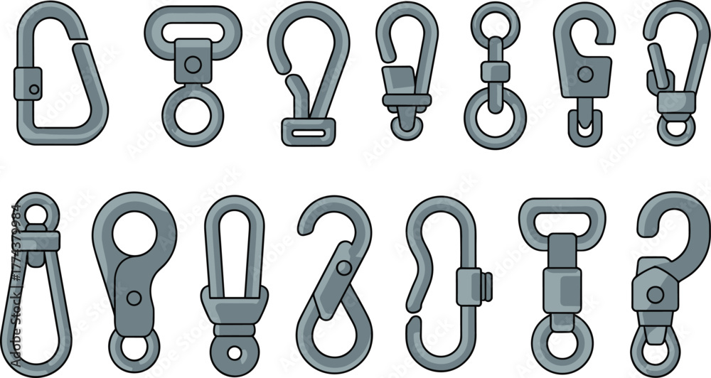 Foto Snap hook and swivel clip collection, hardware accessory design, flat vector ill