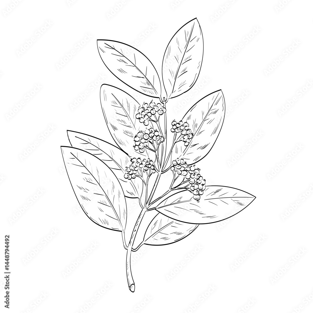 Sticker Plakat Drawing sketch style illustration of an Allspice, Jamaica pepper, myrtle pepper, pimenta or pimento, a dried unripe berry of Pimenta dioica, a midcanopy tree done in black and white line art