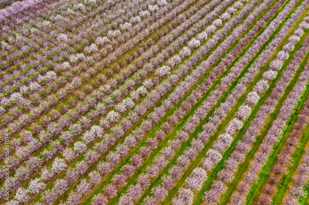 Sticker Plakat Rows of blooming almond trees, aerial photo taken in Northern California near Sa