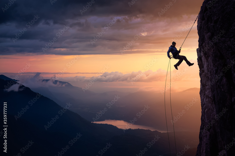 Sticker Plakat Epic Adventurous Extreme Sport Composite of Rock Climbing Man Rappelling from a Cliff