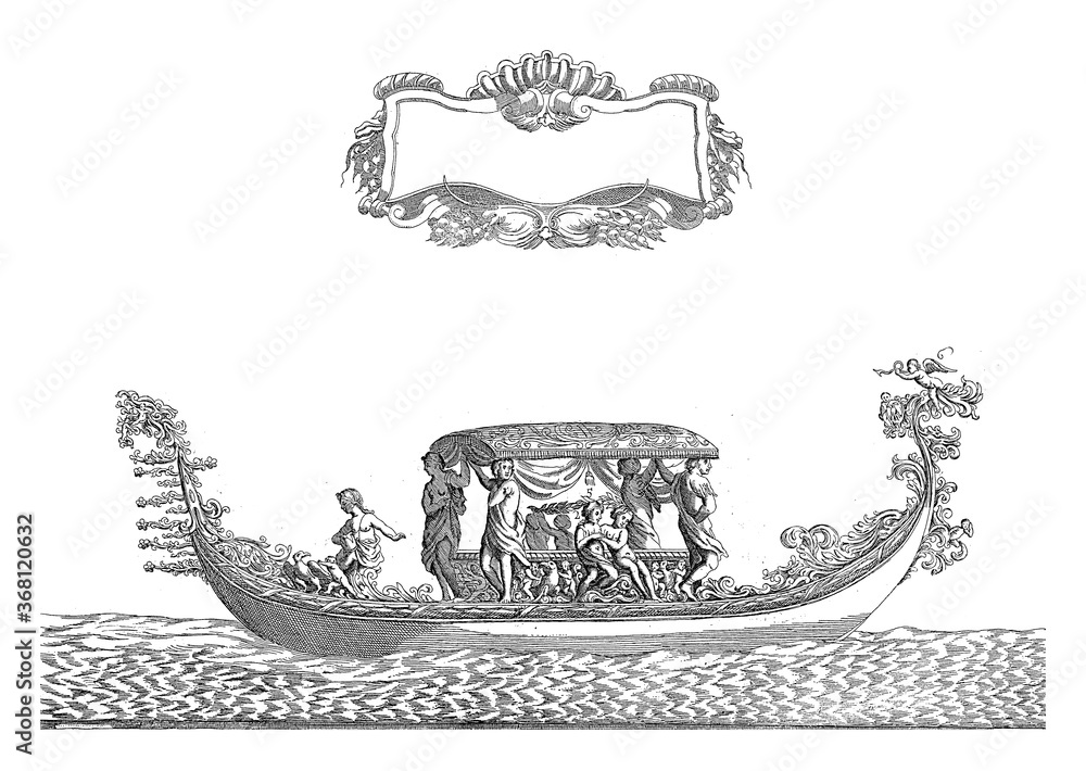 Sticker Plakat Gondola with Allegorical Figures, Antonio Francesco Lucini, 1679, vintage illustration