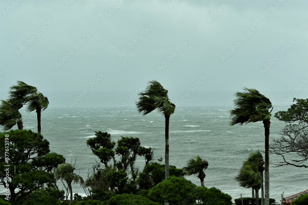 Sticker Plakat 台風で葉が大きく揺れるヤシの木 鹿児島県 指宿市