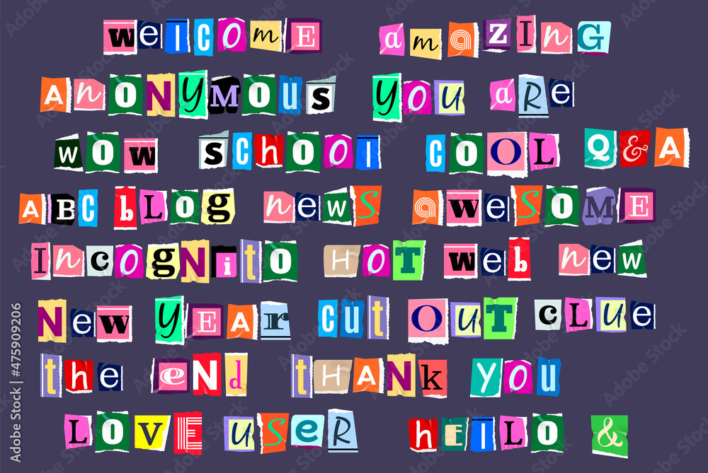 Sticker Plakat Colorful various words made in newspaper style on dark purple background