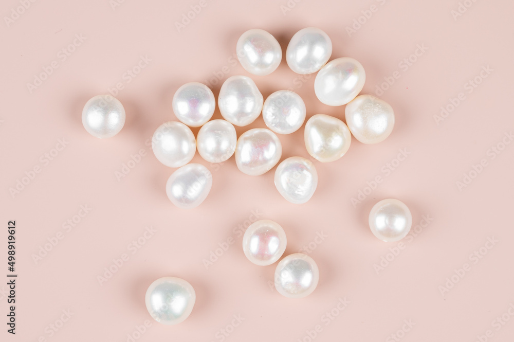 Sticker Plakat Natural freshwater round pearl beads on pink background. Top view