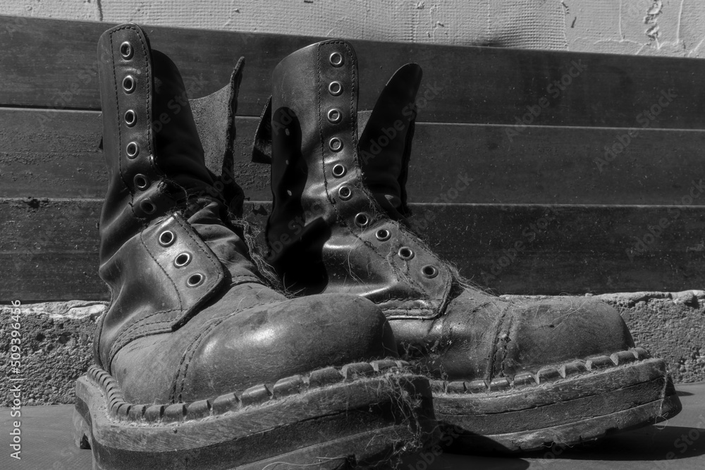 Sticker Plakat a pair of old dusty leather punk boots without laces, closeup black and white ph