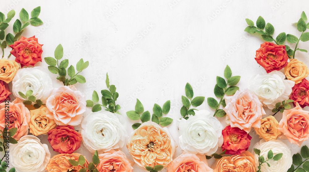 Sticker Plakat Autumn flowers composition made of beautiful roses and ranunculus flowers on light backdrop
