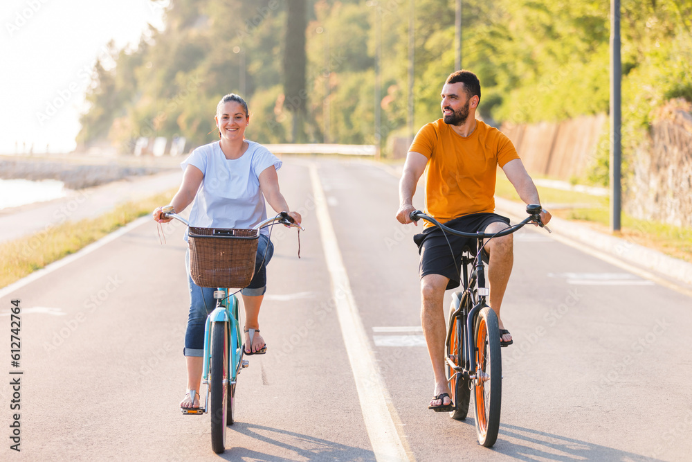 Sticker Plakat Couple taking pleasure in the ride on beach cruiser bikes, pedaling on a wonderf