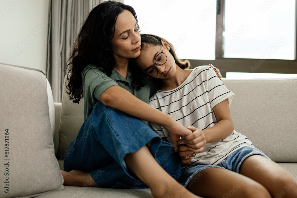 Sticker Plakat Caring mother comforting her teenage daughter, both sitting on the couch at home