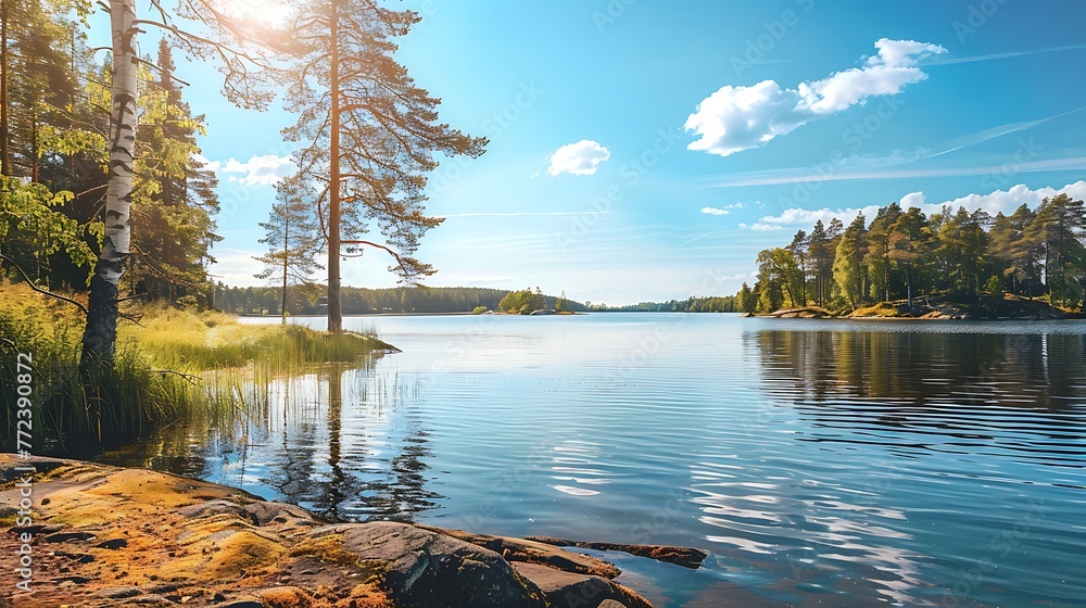 Sticker Plakat Beautiful finnish lake photographed in the bright hot summer