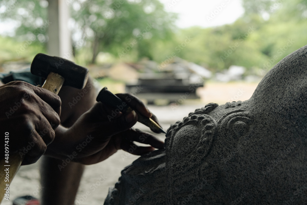 Foto Stone Carver India hand Carving stone, craftsman shaping stone, art and crafts