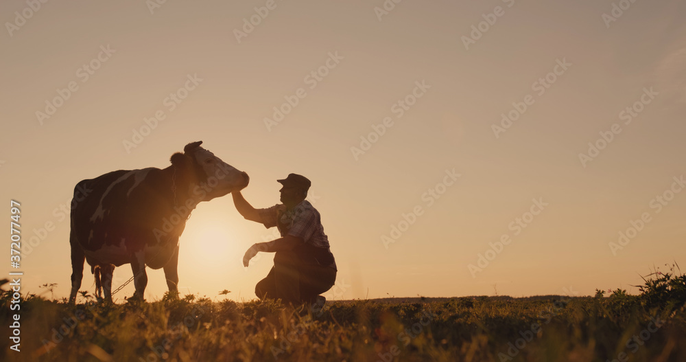 Bild auf Leinwand The owner is near his cow at sunset