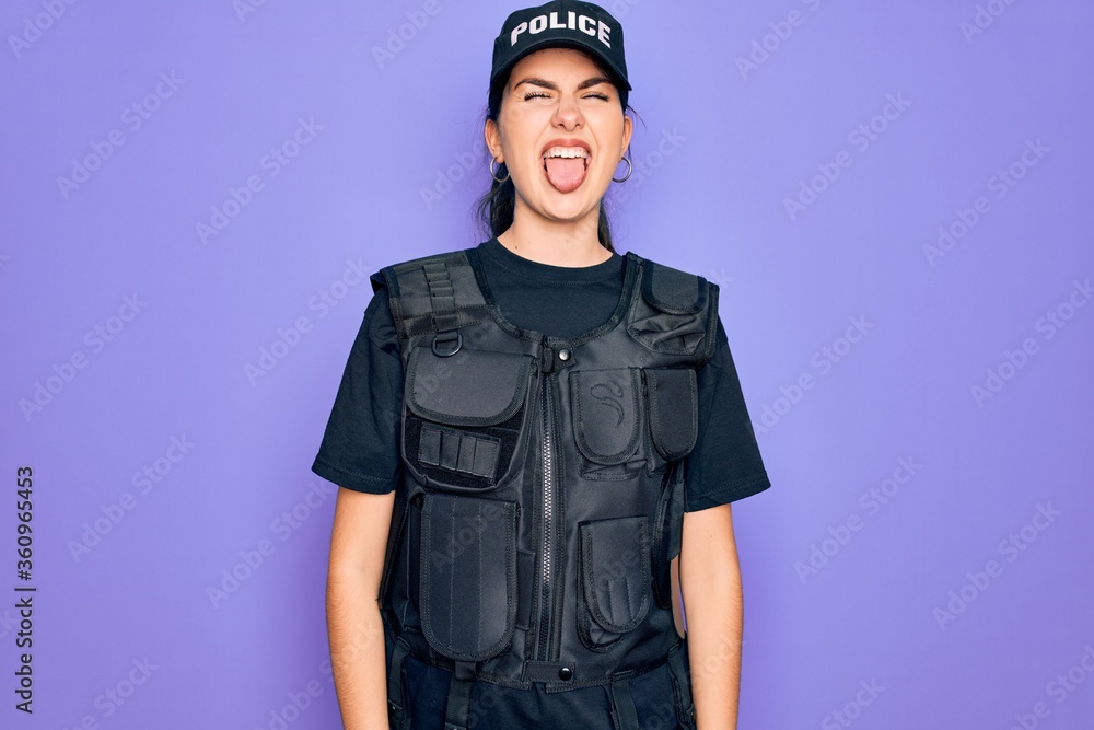Bild auf Leinwand Young police woman wearing security bulletproof vest uniform over purple background sticking tongue out happy with funny expression